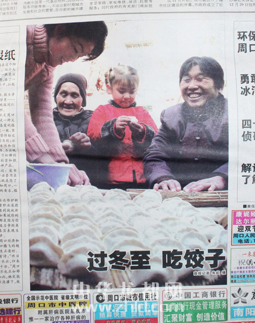 ????創(chuàng)刊號頭版壓軸圖片《過冬至,吃餃子》,拍攝的是80多歲的姥姥、50多歲的媽媽、30多歲的媳婦、五六歲的小女孩四世同堂歡天喜地包餃子的場景。媳婦搟餃子皮,姥姥、媽媽包餃子,五六歲的小女孩也來湊熱鬧,拿起一個餃子皮學(xué)著大人的模樣包餃子,剛剛包好的一大鍋蓋餃子令人垂涎。特別是按照晚報的送報時間,創(chuàng)刊號報紙送到千家萬戶時正好是上午11時之前,此時正是人們包好餃子準(zhǔn)備煮餃子的時間??上攵蠹乙贿吰纷x屬于周口人自己的晚報、欣賞和諧家庭歡天喜地包餃子的圖片,一邊把包好的餃子下到沸騰的開水鍋里,那煮出的餃子香味和著晚報濃濃的墨香,香飄滿城,沁人心脾。