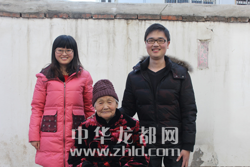 ????昨天上午,在上海相識、相知、相愛的沈丘人郭鑫和蘇州吳江人迮娟芬,婚后首次回到沈丘老家,拜會親友。圖為小兩口與87歲的奶奶合影。