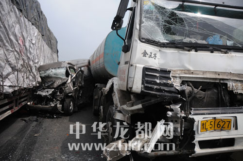 ????現(xiàn)場,20多輛汽車駕駛室嚴重變形。一輛懸掛晉M牌照拉木材的貨車的駕駛室被撞成一團,方向盤甩在4米外的路面上。約2公里長的地面上散落了不少貨物、車窗碎片及大片機油。