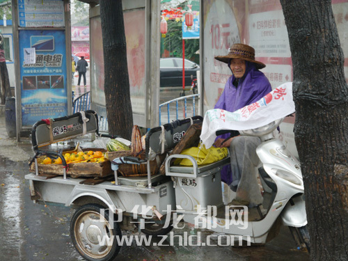 賣柿子的老人在公交車站避雨