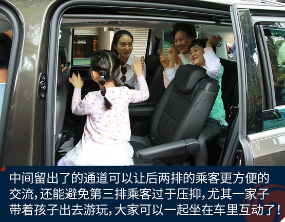 中間留出了的通道可以讓后兩排的乘客更方便的交流,還能避免第三排乘客過于壓抑,尤其一家子帶著孩子出去游玩,大家可以一起坐在車?yán)锘?dòng)了!