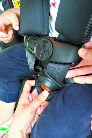 兒童安全座椅的安全帶是五點式,不僅左右扣,還得上下鎖,扣上之后,還得拉緊安全帶,以確保安全性,但同時安全帶不能拉得太緊。