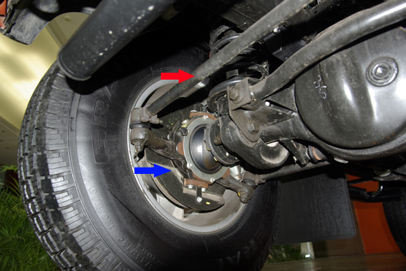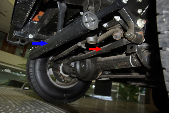 ????后軸特寫圖二,藍(lán)色箭頭所指為拖臂,紅色箭頭所指為后防傾桿,對(duì)于衛(wèi)士的車重而已,其粗細(xì)不能提供很好的仿側(cè)傾效果。后軸依然采用螺旋彈簧作為彈性元件。