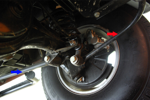 ????細(xì)節(jié)處,剎車的油管外側(cè)有護(hù)板(箭頭處)進(jìn)行周全保護(hù),有效杜絕越野時(shí)由車輪攪入的尖銳物體劃傷油管。