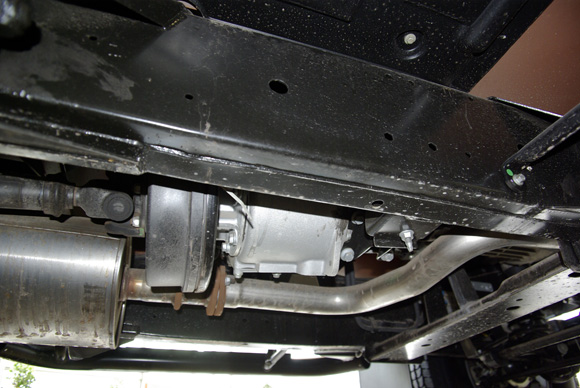 ????衛(wèi)士的大梁及中央差速器特寫,圖中可以看到衛(wèi)士的大梁非常的厚實(shí)粗壯。