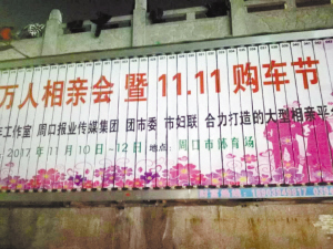 ????據(jù)了解,周口萬人相親會(huì)是由市委組織部青年工作辦公室、共青團(tuán)周口市委、市婦聯(lián)、周口報(bào)業(yè)傳媒集團(tuán)聯(lián)合主辦的大型相親平臺(tái)。為再一次給廣大消費(fèi)者搭建更好的選車、購(gòu)車平臺(tái),周口報(bào)業(yè)傳媒集團(tuán)決定于11月10日至12日在市體育場(chǎng)隆重舉辦2017周口萬人相親會(huì)暨“雙十一”購(gòu)車節(jié)。