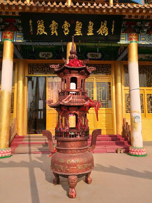 站在昆山女媧宮前向南看,一座高大宏偉的建筑物映入記者眼簾,由于它坐北朝南,我們只能看到它的背影。趙俊明告訴我們,那棟建筑物也是一座敬奉女媧娘娘的大殿,叫做媧皇圣宮寶殿。它是由一位女香客自發(fā)捐資修建的,這座氣派的大殿從無到有、從小到大整整用了14年時間,花費近千萬元。