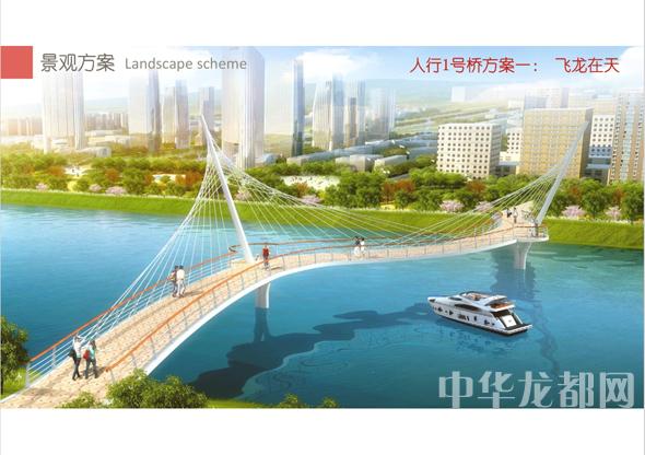 人行1號橋的設計方案有兩套,分別為“飛龍在天”和“騰飛之翼”。“飛龍在天”為雙塔斜拉橋。記者從效果圖中看到,該橋呈現(xiàn)出優(yōu)美的線條,宛如一條長龍騰空在天。“騰飛之翼”為V腿連續(xù)鋼箱梁橋。記者從效果圖中看到,橋體簡潔流暢,時尚現(xiàn)代,橋墩形成穩(wěn)固的三角形,像兩只燕子展翅高飛。