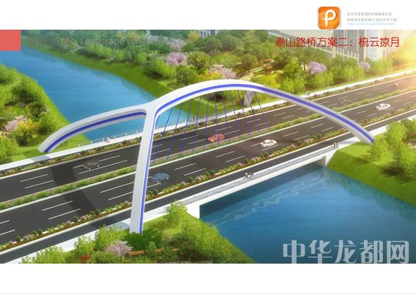 泰山路橋的設計方案有兩套,分別為“錚錚鐵骨”和“梳云掠月”?!板P錚鐵骨”為下承式系桿拱橋。記者從效果圖中看到,其拱體骨架給人一種力量感,拱身視線通透,簡潔明快。“梳云掠月”為鋼筋混凝土提籃拱橋。記者從效果圖中看到,該橋的拱圈造型獨特,簡潔又不失大氣。