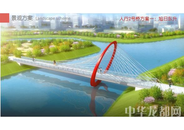 人行2號橋的設計方案有兩套,分別為“旭日東升”和“氣貫長虹”?!靶袢諙|升”為圓形塔懸索橋。記者從效果圖中看到,該橋的橋塔為圓形,猶如一輪東升的太陽,象征著城鄉(xiāng)一體化示范區(qū)蓬勃發(fā)展的未來?!皻庳為L虹”為中承式系桿拱橋。該方案結合中國玉帶橋的古典元素、抽象古典幾何美學,采用現(xiàn)代的設計手法,創(chuàng)作出現(xiàn)代感和中國傳統(tǒng)橋梁元素雜糅的橋梁設計。