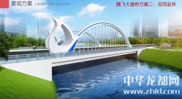 騰飛大道橋的設計方案有兩套,分別為“彩蝶飛舞”和“雙鳳呈祥”?!安实w舞”為下承式鋼管拱橋,寬36米。記者從效果圖中看到,橋兩側的拱圈,極具色彩感,給人一種賞心悅目的感覺。“雙鳳呈祥”為裝飾鋼管拱橋,寬36米。該橋采用“雙鳳”造型,象征天下太平,富含吉祥之意。
