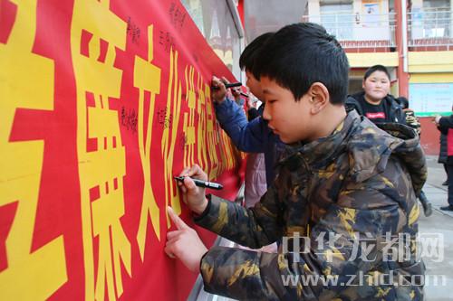 中華龍都網(wǎng)訊(周口報業(yè)全媒體記者 韋偉 通訊員 王佳佳 辛曼 攝)今年是毛澤東“向雷鋒同志學(xué)習(xí)”題詞55周年。3月5月,沈丘縣紀(jì)委監(jiān)委聯(lián)合縣義工聯(lián)走進(jìn)沈丘二高、河南小學(xué),開展“孝廉文化進(jìn)校園”活動,旨在弘揚(yáng)雷鋒精神和“孝善儉廉”的美德。圖為:學(xué)生們在“弘揚(yáng)雷鋒精神,做‘孝善儉廉’美德少年”條幅前簽字。