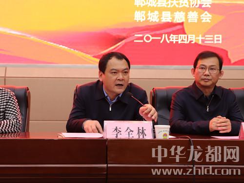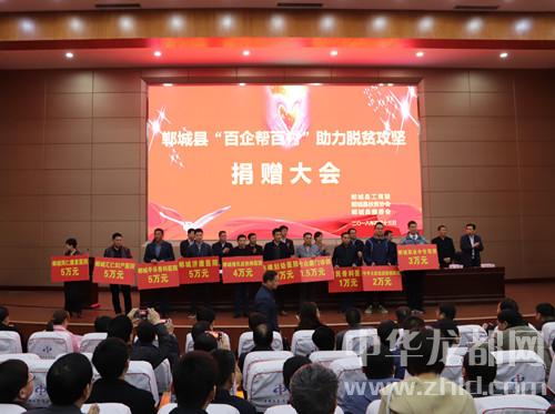 中華龍都網(wǎng)訊(周口報(bào)業(yè)全媒體記者 徐松 文/圖)4月13日,鄲城縣召開“百企幫百村”助力脫貧攻堅(jiān)捐贈大會,全縣129家企業(yè)反哺社會助力脫貧攻堅(jiān),現(xiàn)場捐贈近1300萬元。鄲城縣四個(gè)班子領(lǐng)導(dǎo)、部分縣處級領(lǐng)導(dǎo)干部、縣慈善會會長、縣扶貧協(xié)會會長、縣直各單位和鄉(xiāng)鎮(zhèn)負(fù)責(zé)人等參加捐贈大會??h委書記羅文閣發(fā)表講話,縣長李全林主持會議。