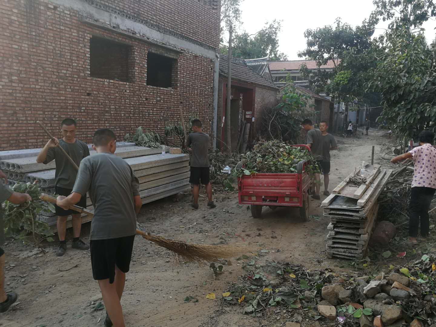 當(dāng)日,太康縣410名預(yù)定新兵走進(jìn)該縣高賢鄉(xiāng)小郭行政村,幫助村民打掃街道衛(wèi)生、鏟除路邊雜草、清理村舍淤泥,并對(duì)暴雨過后倒塌的院墻進(jìn)行修復(fù),“小戰(zhàn)士們”一個(gè)個(gè)生龍活虎、斗志昂揚(yáng),不怕臟、不怕累,爭著搶著進(jìn)行義務(wù)勞動(dòng),幫助村民收拾街道院落。
