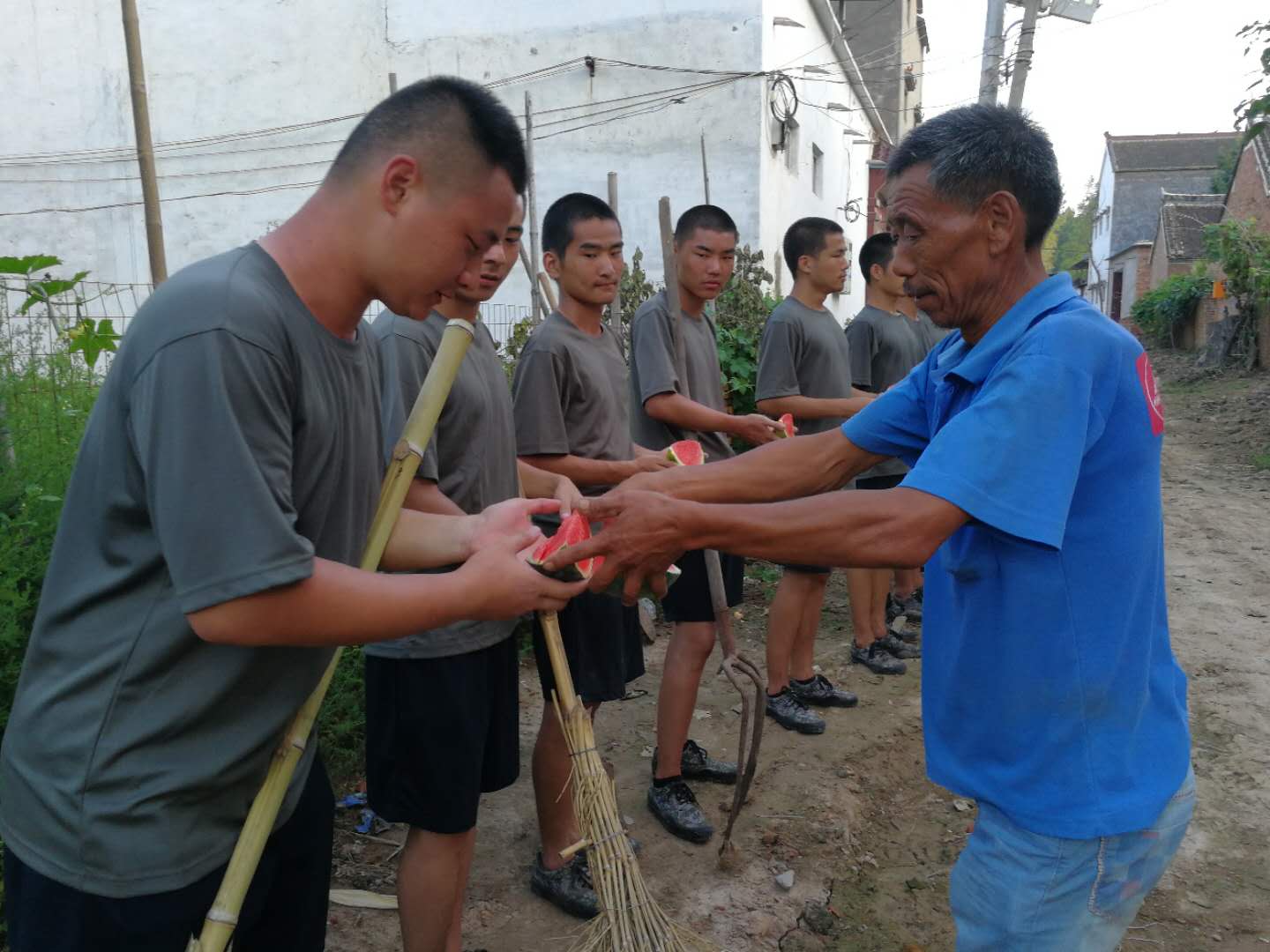 此次活動(dòng)深受鄉(xiāng)親們的贊賞和歡迎,有的老鄉(xiāng)拿出自家的勞動(dòng)工具,與我們 “小戰(zhàn)士”一起勞動(dòng),有的送來礦泉水和西瓜慰勞正在勞動(dòng)中的“小戰(zhàn)士”,展現(xiàn)出了一幅軍愛民、民擁軍,軍民魚水情深的畫卷。