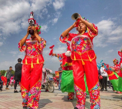 廣場上,一排排碩大的紅氫氣球高懸,氣球下縣掛著祝賀農(nóng)民豐收節(jié)的標語。穿著各種鮮艷顏色的表演服裝的民間藝術表演隊,給節(jié)日增光添彩,擂響盤鼓,為節(jié)日助威。從全縣23個鄉(xiāng)鎮(zhèn)起早趕來的46支民間藝術表演隊伍,伴隨著悠揚的音樂,喧天的鑼鼓在廣場上各顯其能。腰鼓、盤鼓、耍獅子、劃旱船、抬花轎、挑花籃、廣場舞也以不同的方式表達著豐收的喜悅。