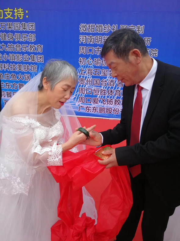 10月19日上午,在周口宏德養(yǎng)老孝道文化節(jié)上,18對老人身著盛裝參加老年集體婚禮。典禮開始后,18對老人手牽紅絲帶走上舞臺,經(jīng)過現(xiàn)代式結(jié)婚典禮流程后,老人們互贈禮物。老人們非常激動,他們相互擁抱,有的還流下了眼淚。臺下的子女也激動萬分,紛紛走上舞臺與自己的父母擁抱在一起。