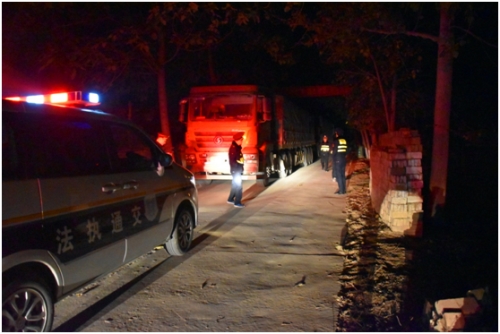 當(dāng)日22時(shí)40分,該所副所長楊春風(fēng)同志帶領(lǐng)兩個(gè)執(zhí)法中隊(duì),對(duì)縣區(qū)域內(nèi)重點(diǎn)路段24小時(shí)不間斷巡查,在巡查到轉(zhuǎn)樓鄉(xiāng)通往龍曲鎮(zhèn)的X001線時(shí),發(fā)現(xiàn)4輛大型超限車輛,其中3輛為“百噸王”,1輛為嚴(yán)重超載標(biāo)掛。司機(jī)為抗拒檢查,鎖閉車門遠(yuǎn)處觀望,我執(zhí)法人員堅(jiān)守執(zhí)法現(xiàn)場(chǎng),并及時(shí)調(diào)用拖車支援,另指派執(zhí)法人員與司機(jī)溝通,在動(dòng)之以情、曉之以理的講解治超政策下,得到了司機(jī)的主動(dòng)配合,把車輛暫扣至超限車輛卸載點(diǎn)。