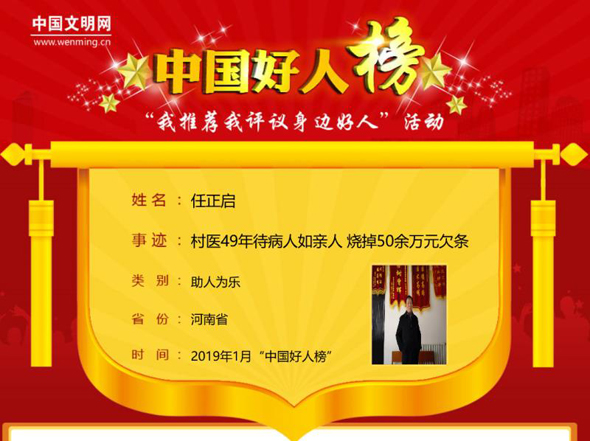 太康縣馬頭鎮(zhèn)任莊村村醫(yī)任正啟,待病人如親人,用腳步丈量任莊村周邊的每寸土地,他49年燒掉50余萬元貧困戶看病欠條。2月25日,中國(guó)文明網(wǎng)發(fā)布消息:任正啟榮登2019年1月“助人為樂類”“中國(guó)好人榜”。