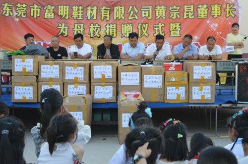 當日下午,廣東東莞富明鞋材有限公司董事長黃宗昆為母校薛廟小學師生捐贈愛心運動鞋儀式在馬頭鎮(zhèn)薛廟小學舉行。馬頭鎮(zhèn)中心校副校長李永長、中心校辦公室主任章紅勝、薛廟行政村黨支部書記黃志華等村兩委領導、校長黃景思、名譽校長孫道紅、全校260 多名師生及部分學生家長600多人參加了當天的捐贈儀式。