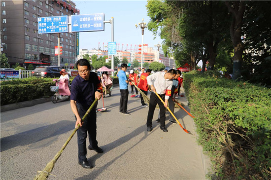 6月4日,烈日炙烤著大地,氣溫升至37攝氏度,路面溫度更高。鄲城縣財(cái)政局長(zhǎng)張振新帶領(lǐng)“創(chuàng)衛(wèi)”值班人員,正在新華路西段責(zé)任區(qū)內(nèi)清掃路面、撿拾落葉、噴灑花木、落實(shí)“門前五包”……大家忙得汗流浹背,始終無一人脫崗。