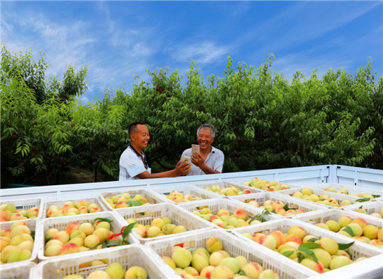 6月19日,在萬畝桃園里,桃農(nóng)臉上洋溢著收獲的喜悅,看見記者拍照,熱情地從籃里桃了一個又大又紅的鮮桃遞給記者品嘗(圖一)。一名慕名而來的游客購買了十幾斤鮮桃后掏出手機(jī)掃描桃農(nóng)的手機(jī)微信收款碼支付(圖二)。