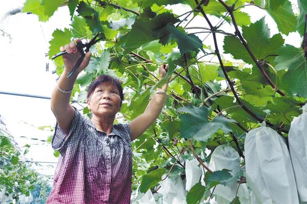 8月3日,一村婦在河南省商水縣天力葡萄種植農(nóng)民專業(yè)合作社為葡萄剪枝打杈。