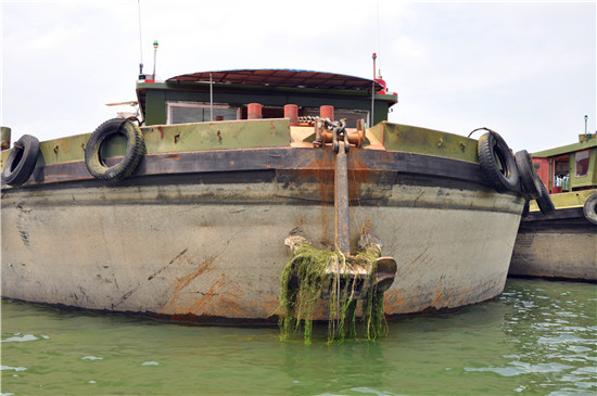8月8日上午,在碧波蕩漾的商水港區(qū),6條載重上千噸的大船緊靠在一起,一船金燦燦的玉米,兩船褐色的石子,三船白色晶體方解石。站在港口上方遠(yuǎn)遠(yuǎn)望去,6條貨船像一塊彩條布鑲嵌在綠色的河面上。