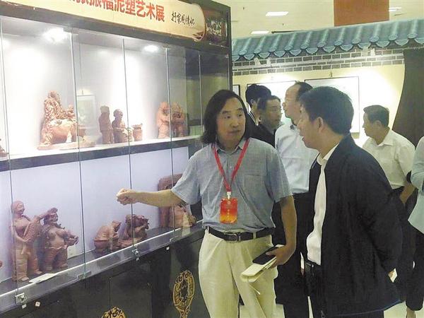 9月13日上午,2019年中國(鄭州)中秋文化節(jié)、中國農(nóng)民豐收節(jié)、國慶節(jié)“三節(jié)聯(lián)動”系列傳統(tǒng)文化活動在鄭州綠博園啟動。鄲城縣泥塑藝人張振福受邀攜帶300多件泥塑作品參展,為活動帶去了濃濃的鄉(xiāng)土味兒。圖為張振福正在向參觀群眾介紹作品。