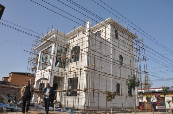 11月20日,在全國文明村——商水縣巴村鎮(zhèn)上城村,村民朱云山家的3層輕鋼別墅正在建造中。這是該村第一幢新式別墅,全框架結(jié)構(gòu),造型別致,沒有使用砂石、水泥、磚瓦等,全部使用新型環(huán)保建材,建造過程就像搭積木一樣,并具有節(jié)能環(huán)保、防風(fēng)抗震、隔音防火、造價低廉、建造快等特點,很受喜歡。圖為附近村民前來參觀。記者 付永奇 攝