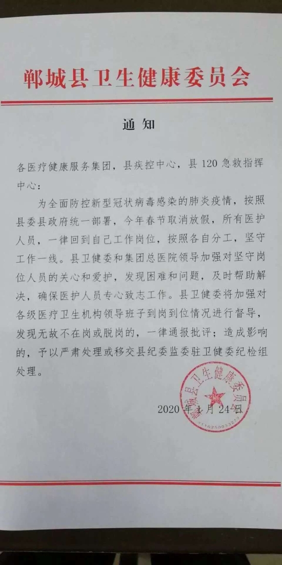 在全國疫情防控形勢較為嚴重情況下,衛(wèi)健委充分認識到加強新型肺炎疫情防治工作的重要性和急迫性,于1月24下發(fā)取消全縣醫(yī)護人員春節(jié)假期的通知。要求所有醫(yī)護人員,一律回到自己工作崗位,按照各自分工,堅守工作一線。