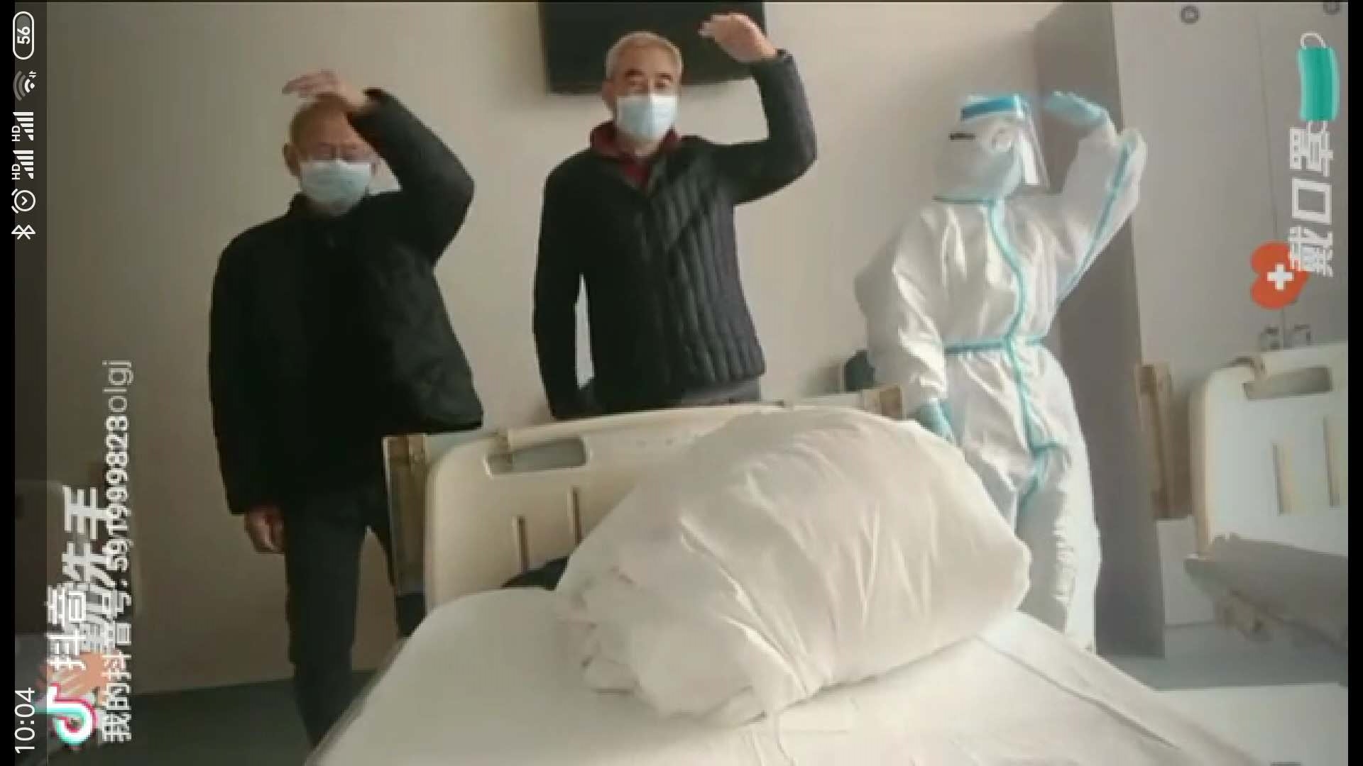 3月6日,周口援鄂醫(yī)療隊(duì)的微信群因?yàn)橐欢味兑粢曨l而變得歡樂。視頻中,兩位老人和一位穿著防護(hù)服的護(hù)士,正踩著“小黃鴨”的魔性節(jié)奏在病床前尬舞……