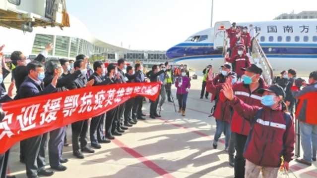 3月30日上午,湖北武漢,《歌唱祖國》響徹云霄。鄲城縣援鄂抗疫的5名醫(yī)護(hù)隊(duì)員隨河南醫(yī)護(hù)隊(duì)一道,完成使命、起程凱旋,今天下午到周口。