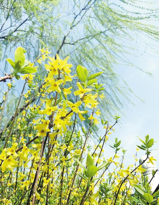 作為春天的信使,一叢叢嬌黃的連翹花,為大地帶來(lái)了濃濃春意?;ǘ湓诖猴L(fēng)的吹拂下?lián)u曳,團(tuán)團(tuán)簇簇,涌動(dòng)如金色波浪。走近之時(shí),聞花香淡雅、賞滿枝金黃,人們也以“報(bào)春花”來(lái)稱呼它。