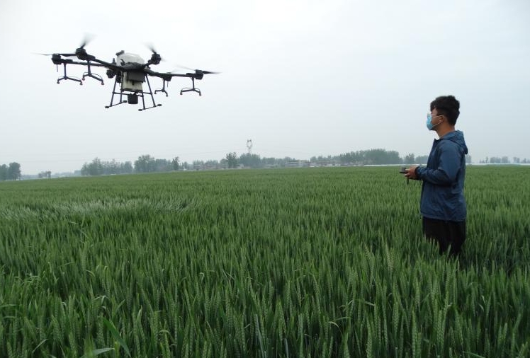 4月18日,沈丘縣周營鎮(zhèn)王寨村小麥高產(chǎn)示范基地,飛防技術(shù)人員在操作無人機進行“一噴多防”作業(yè),噴施“防治病蟲害+強筋壯骨增產(chǎn)營養(yǎng)液”套餐。
