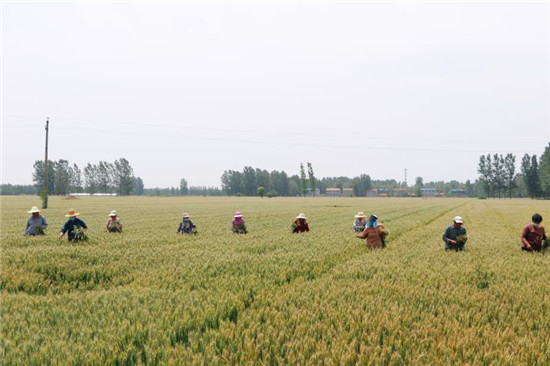 5月16日,記者在鹿邑縣棗集農場看到,2800多畝的良種小麥繁育基地里50多人分成四支隊伍一字排開,在綠波碧浪的小麥田里認真排查、進行提質去雜工作。