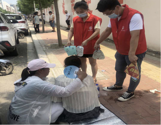在各考點(diǎn)志愿活動(dòng)現(xiàn)場(chǎng),志愿者們?cè)缭绱钇鹫陉枎づ?,擺好桌子、礦泉水,防暑應(yīng)急藥品等用品,為考生和家長(zhǎng)提供休息場(chǎng)所,在炎熱的夏日里為他們送上一份清涼和安心。同時(shí),他們還維持考點(diǎn)周邊市容環(huán)境的整潔有序,對(duì)于大聲喧嘩等不文明行為及時(shí)勸阻;協(xié)助交警疏導(dǎo)交通,減少道路噪音對(duì)考試的影響,確保道路交通安全有序。期間,陸續(xù)有家長(zhǎng)及考生前來咨詢就診,志愿者們熱情接待,為其測(cè)量血壓,提供礦泉水、解暑藥品等,得到家長(zhǎng)及考生的一致好評(píng)。