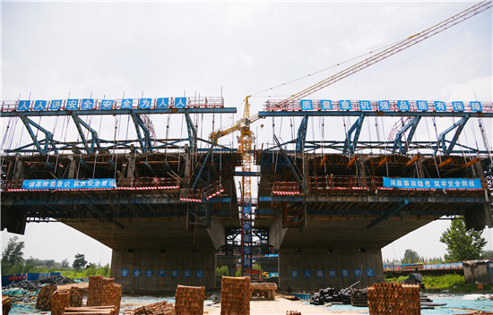 周口北環(huán)跨賈魯河大橋是我市在建重點工程,全長904米,其中主橋總長286米,共3跨,采用懸澆法施工。7月16日中午,記者在工地看到,經(jīng)過一年多的施工,工程完成80%左右,為了保障工期和質(zhì)量,工人們冒著酷暑,在跨河的兩列橋墩上,忙碌著澆鑄施工,隨著澆鑄橋體的延伸,預(yù)計年底橋體完成合攏。