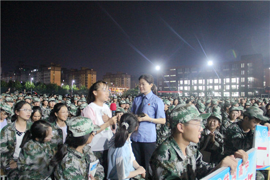 "你們正處于人生的花季,知識是養(yǎng)分,那么法律知識就好比是殺蟲劑,要學好,更要用好,要做到知法、守法、用法,在法治護航下遠離校園欺凌,拒絕電信網(wǎng)絡詐騙,不義之財不可取,防范之心不可無……”。8月29日晚上7點,黃昏謝去,暮色已經(jīng)模糊起來了,伴著淺淺的晚霞,扶溝縣檢察院檢委會專職委員郁玉琴帶領該院“女檢察官特別護未隊”的三名女檢察官到扶溝高中為正在接受軍訓的1600余名高一新生們上了一堂別開生面的法治課。