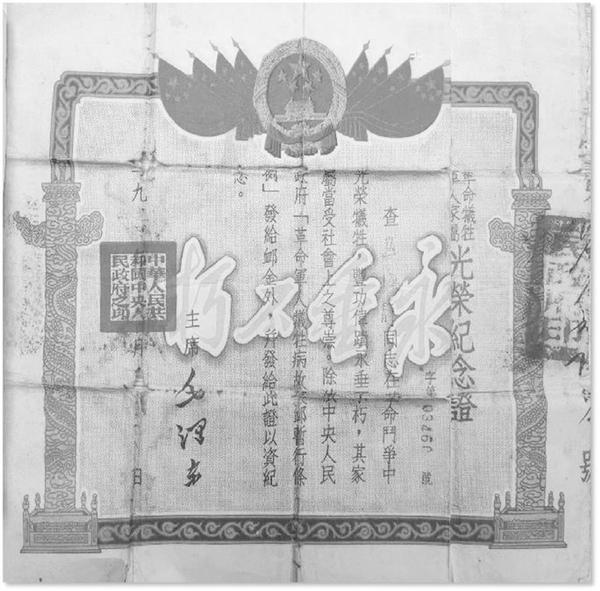 中央人民政府頒發(fā)的趙海靜烈士紀(jì)念證
