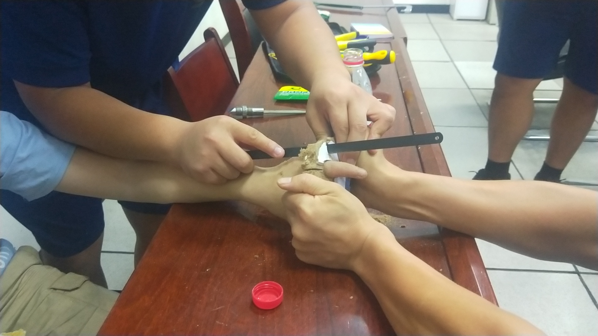看到救援人員,小男孩十分害羞,有點不好意思。“我看桌子上有個孔,就是想看看手指能不能伸進去,結(jié)果就拔不出來了?!本仍藛T經(jīng)觀察發(fā)現(xiàn),小男孩左手無名指被卡在課桌木板上的小孔里,木板已被裁下,木板材質(zhì)為鋸末壓縮板,此時小男孩手指被卡部位周圍已發(fā)生腫脹必須馬上處理。救援人員利用鋼鋸將木板一點點鋸開,然后又用鉗子用力將木板夾開,經(jīng)過3分鐘救援,成功將禁錮小男孩手指的木板摘除。看到木板被從手上取下,男孩長長地舒了口氣。