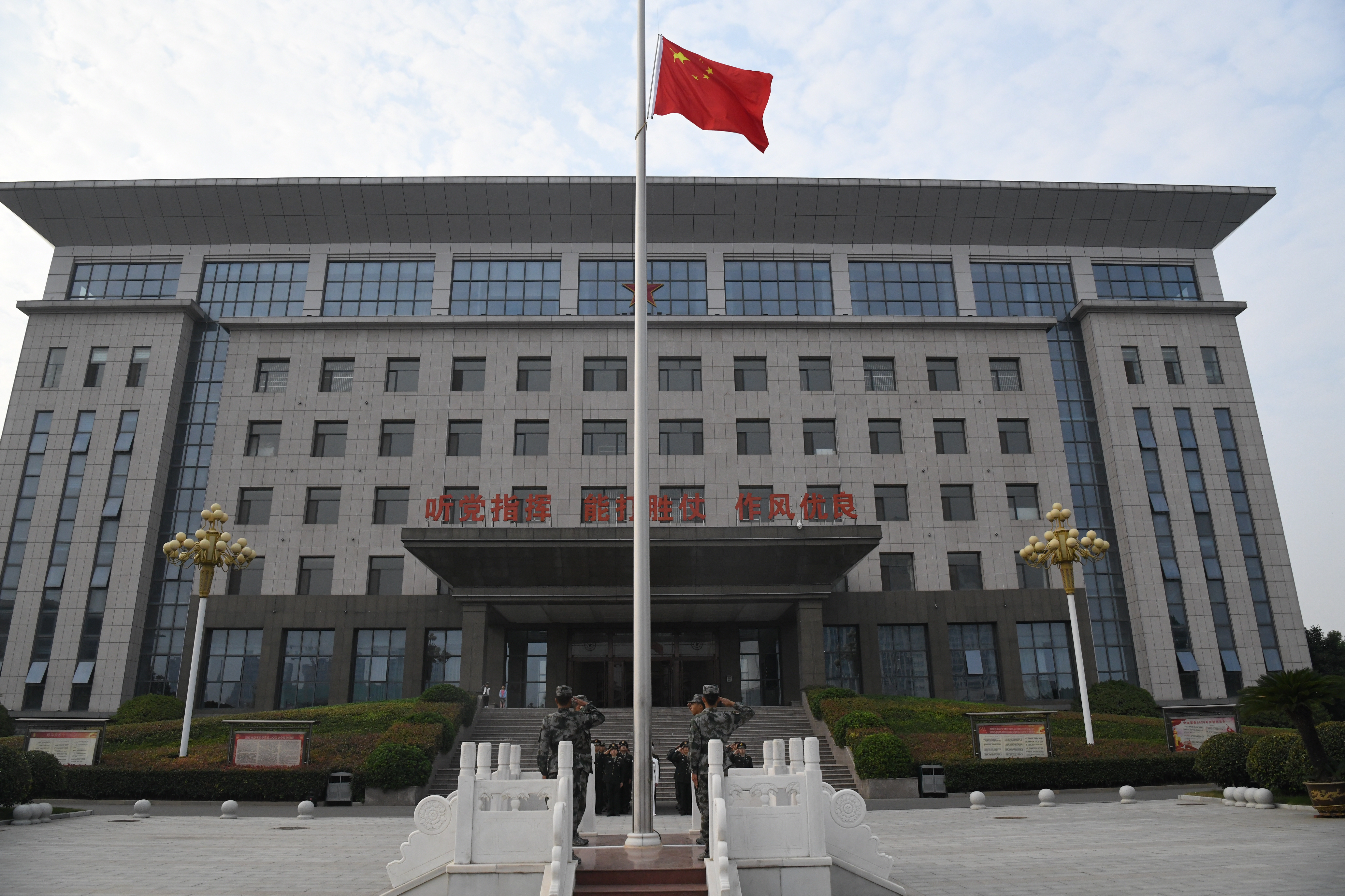 國旗飄揚(yáng)激發(fā)革命斗志,軍歌嘹亮詮釋忠誠誓言。10月1日上午,周口軍分區(qū)舉行升國旗儀式慶祝中華人民共和國71周年華誕。來自周口軍分區(qū)機(jī)關(guān)、市民兵武器裝備倉庫的全體官兵職工、文職人員80人參加了儀式。周口軍分區(qū)司令員湯維政主持儀式。當(dāng)日8時許,全體官兵在軍分區(qū)機(jī)關(guān)營區(qū)升旗臺前整齊列隊(duì),精神飽滿,士氣昂揚(yáng),帶著對祖國最熱忱的祝福,帶著對生活最美好的憧憬,等待著最莊嚴(yán)時刻的到來。隨著一聲“迎國旗”的洪亮口令,英姿颯爽的4名護(hù)旗手邁著鏗鏘有力的步伐護(hù)送國旗走向升旗臺。伴隨著雄壯的《義勇軍進(jìn)行曲》,升旗手抬手振臂,鮮艷的五星紅旗迎風(fēng)展開,在官兵們的注目下冉冉升起。