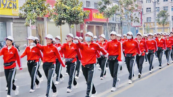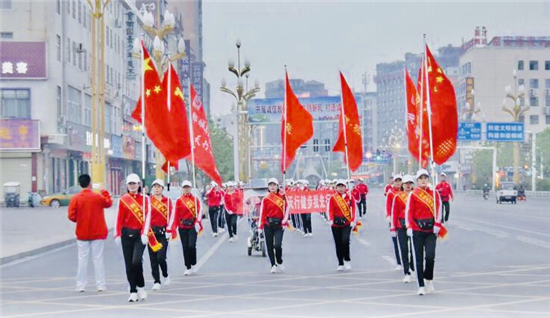 10月11日早晨,鄲城大街上迎來了一道靚麗的風(fēng)景線——他們身著鮮艷的紅色運(yùn)動(dòng)服,肩扛五星紅旗,手扯橫幅,隨著動(dòng)感十足的音樂,昂首闊步徜徉在金色的秋天里……