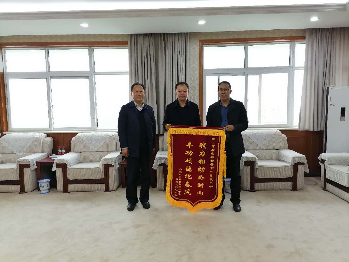 近日,內(nèi)蒙古自治區(qū)通遼市扎魯特旗第一中學(xué)校長劉思超為感謝鄲城一高,特意從1700多公里外趕來,贈送一面“豐功碩德化春風 戮力相助如時雨”錦旗。鄲城縣政府督學(xué)王平崇參加贈送儀式。
