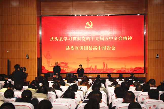 12月12日下午,扶溝縣高中德馨樓七樓會議室掌聲陣陣、座無虛席,扶溝縣學習貫徹黨的十九屆五中全會精神縣委宣講團縣高中報告會正在這里舉行,宣講會特邀縣教體局黨組書記葛偉進行宣講,局機關班子成員,縣高中班子成員和400余名教師參加了宣講會。