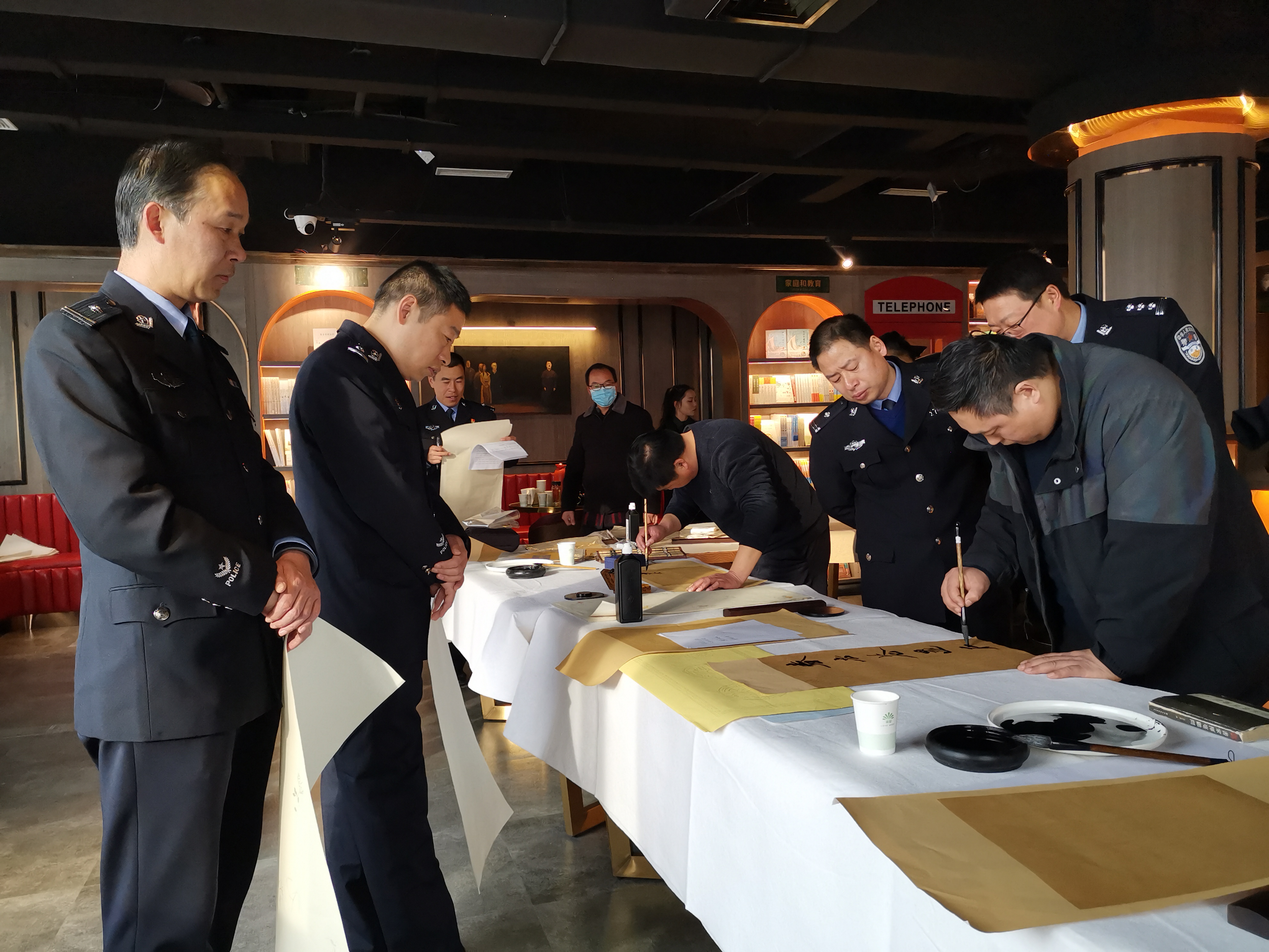 1月10日下午,沽讀書廊二樓翰墨飄香、筆鋒頓挫。為慶祝首個中國警察節(jié),書法家李為、何巖、陳濤、游富華、何祥峰、李雯云、軒敬賢以及祁庚鑫等一行,為川匯區(qū)公安分區(qū)民警義寫書法作品,送來一份特殊的節(jié)日禮物。
