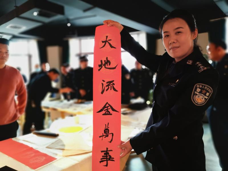 活動現(xiàn)場,氣氛熱烈,書法家們現(xiàn)場揮毫潑墨、筆走龍蛇,帶著喜迎牛年的美好祝愿。民警、輔警爭相圍觀,觀看、揣摩書法家們蒼勁有力的書法作品,房間內(nèi)洋溢著濃郁的節(jié)日氣息。