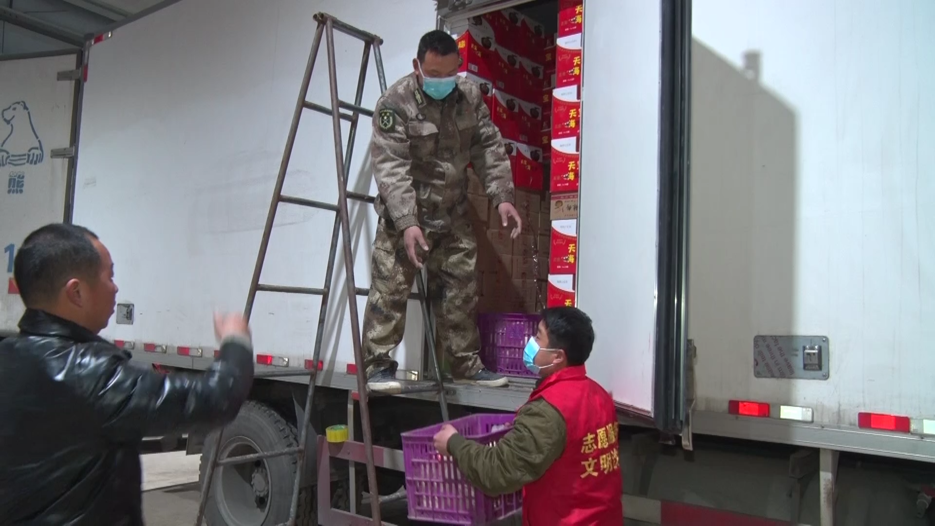 王國輝說:“咱們對接的就是河北南宮市,但是南宮市的工作人員考慮到咱們的安全,也不讓咱們進入南宮的地域,而是去衡水,衡水是低風險,現(xiàn)在不在風險區(qū),這是對方為我們著想。我們把貨到了衡水的外圍一個指定的開闊地方,我們把貨卸下來,我們撤離,然后南宮的同志再過來,轉運到他們車上去?!?/p>