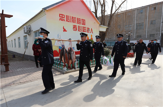 隨著春節(jié)日益臨近,該派出所所長(zhǎng)楊杰和大家商議,“送溫暖送祝?!被顒?dòng),應(yīng)該先從尊老愛幼開始。于是,民警們購(gòu)買了60斤魚、100斤雞蛋和2袋面粉,利用中午休息時(shí)間來到敬老院,給老人們送上新春祝福。