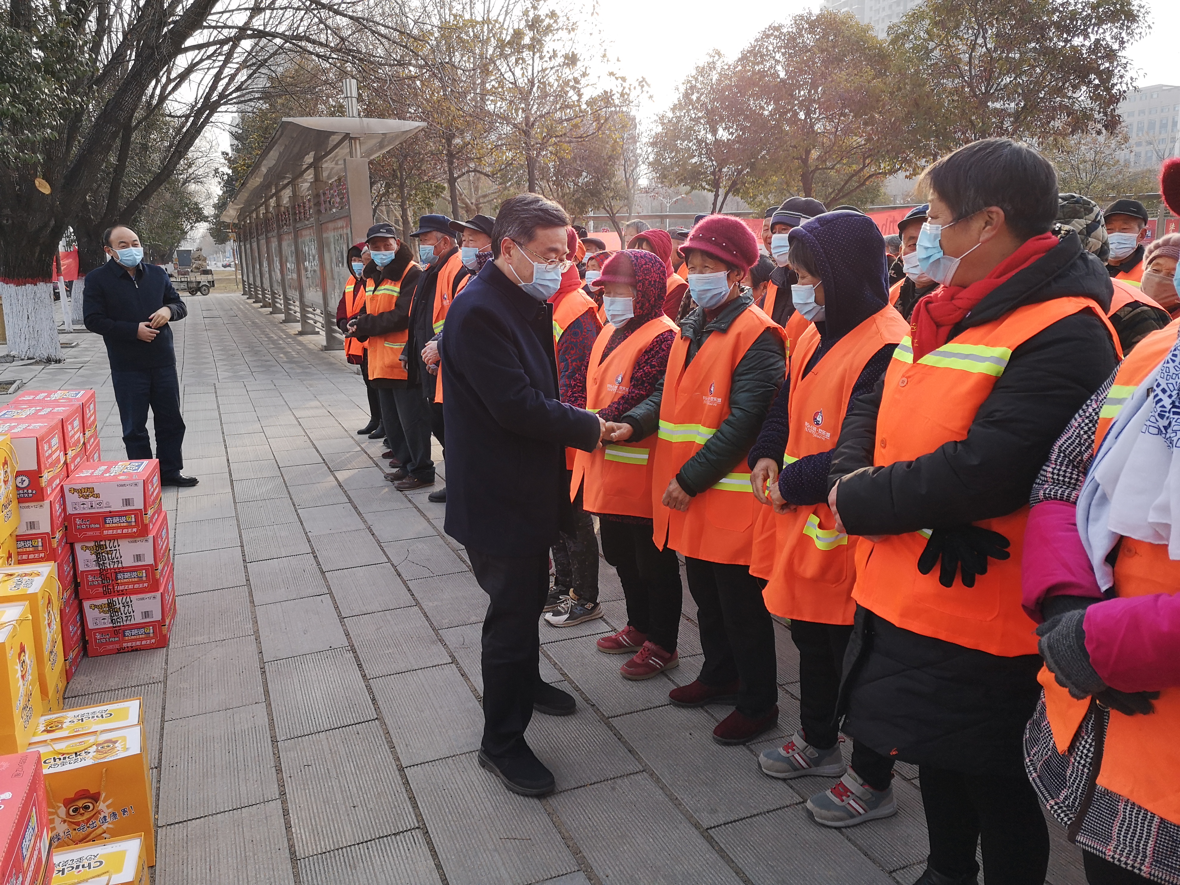 在行政新區(qū)全民健身廣場,皇甫立新、劉國慶同環(huán)衛(wèi)工人們一一握手,并代表縣四個班子向堅(jiān)守一線的環(huán)衛(wèi)工人致以新春的祝福,對他們在過去一年里付出的辛勤勞動表示衷心感謝?;矢α⑿抡f,一年來,環(huán)衛(wèi)工人們起早貪黑、兢兢業(yè)業(yè),為改善居民生活環(huán)境和提升城市形象付出很多心血和汗水,取得了良好效果,城區(qū)環(huán)境和城市面貌有了很大改善,得到了社會各界的一致好評,希望大家繼續(xù)發(fā)揚(yáng)愛崗敬業(yè)、無私奉獻(xiàn)的精神,把縣城衛(wèi)生打掃的更加干凈、整潔,為全縣人民歡度春節(jié)創(chuàng)造一個干凈舒適愉快的環(huán)境。